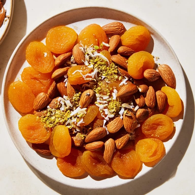 Merken Ein lebendiger, gesunder Snack mit süßen getrockneten Aprikosen und knackigen Mandeln, perfekt für einen schnellen Energieschub oder als elegante Ergänzung zu einer Käseplatte.