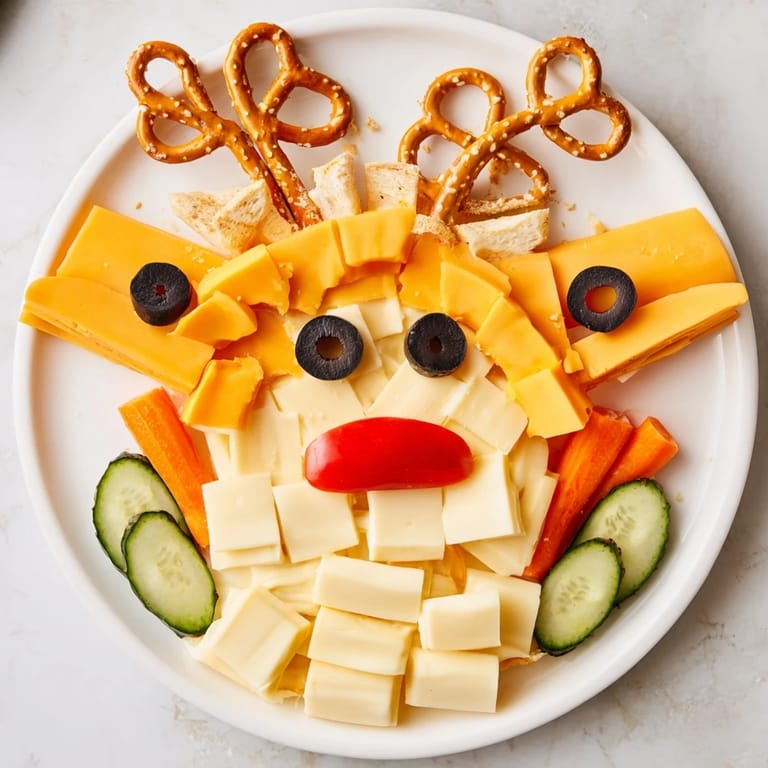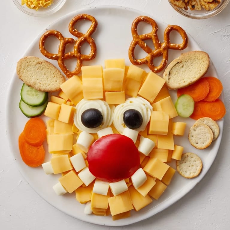 Merken Ein verspieltes festliches Tablett mit verschiedenen Käsesorten und Snacks, die so angeordnet sind, dass sie das Gesicht eines Rentiers nachbilden – ein lustiger, festlicher Genuss, perfekt für Kinderpartys oder Familientreffen.