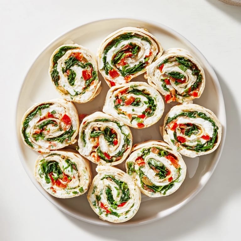 Merken Festliche und bunte Tortilla-Röllchen, gefüllt mit Frischkäse, gerösteten Paprika und Spinat – perfekt für Feiertagspartys und Zusammenkünfte.