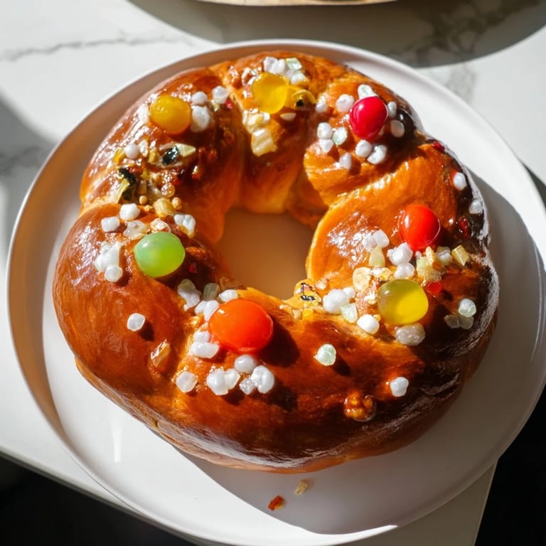 Merken Ein festliches und glitzerndes süßes Brot in Kronenform, verziert mit bunten kandierten Früchten und Zuckerperlen – ein spektakulärer Mittelpunkt, perfekt für Feiern.