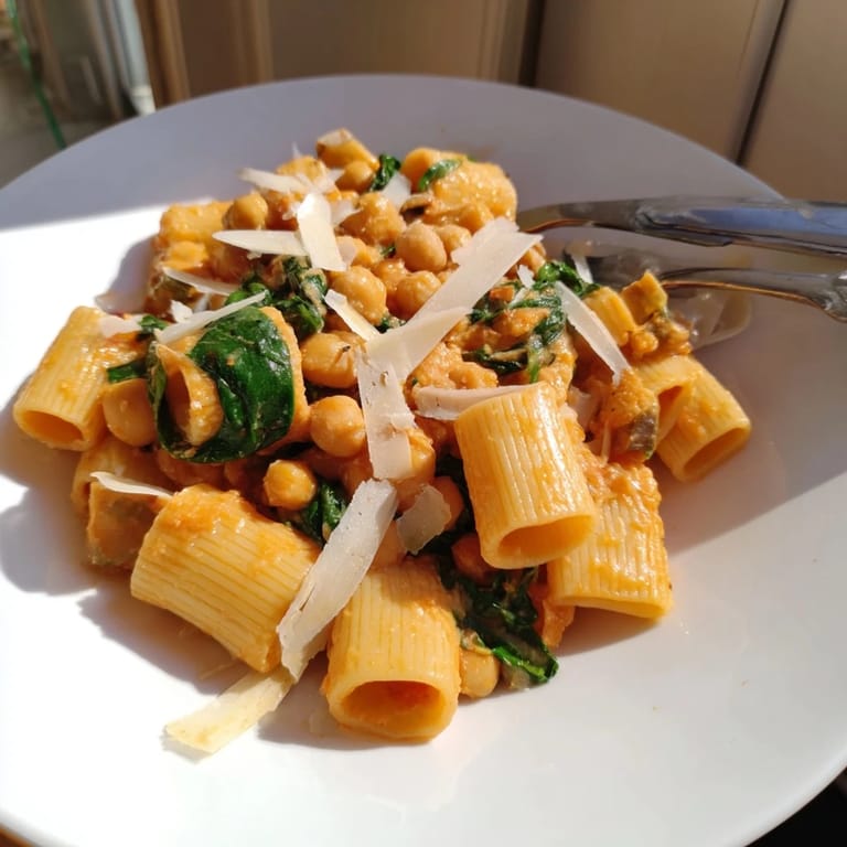 Merken An meinem Geburtstag letztes Jahr wollte ich eigentlich ausgehen, aber ein plötzlicher Regenschauer hat mich nach Hause getrieben. Ich stand in meiner Küche, durchnässt und hungrig, und öffnete den Vorratsschrank. Dort fanden sich Kichererbsen, eine Dose Tomaten und etwas Pasta – mehr brauchte es nicht. Was als Notlösung begann, wurde zu einem der cremigsten, wärmendsten Gerichte, das ich je gekocht habe. Seitdem mache ich es mindestens zweimal im Monat.