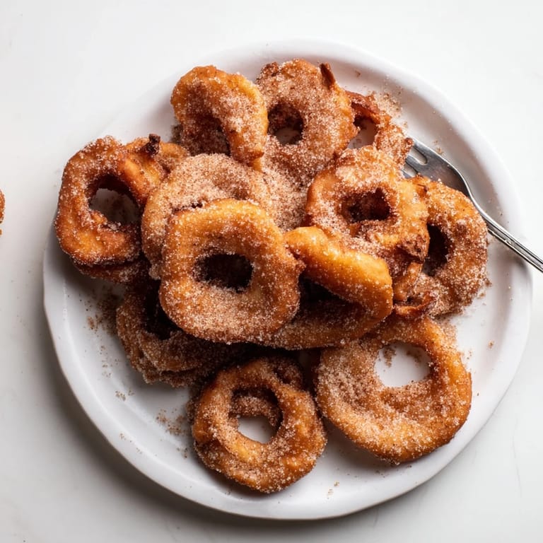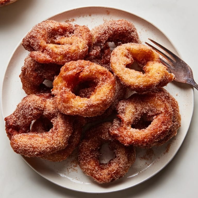 Merken Knusprig außen und zart innen sind diese Apfelküchle im deutschen Stil eine beliebte Herbstspezialität, bestreut mit Zimtzucker und perfekt als Dessert oder gemütlicher Snack.