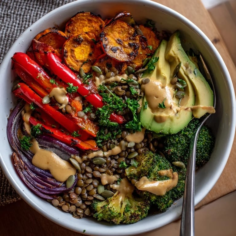 Merken Eine lebendige, nahrhafte Schüssel mit karamellisiertem geröstetem Gemüse und herzhaften Linsen, garniert mit einem würzigen Tahini-Dressing. Perfekt für ein gesundes Mittag- oder Abendessen.