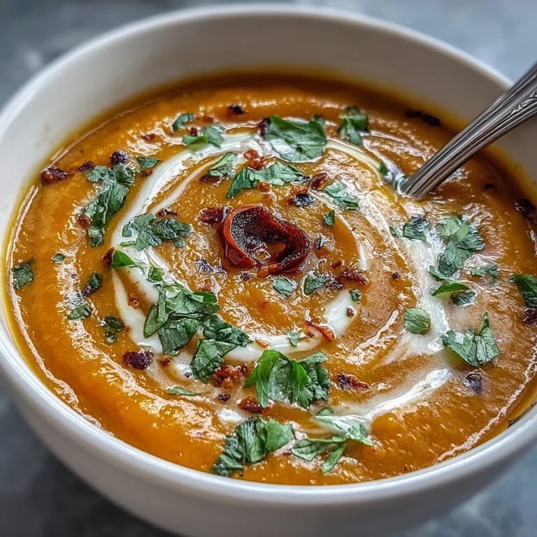 - Den Topf vom Herd nehmen. Mit einem Stabmixer direkt im Topf oder in Chargen im Blender pürieren, bis alles seidig ist – keine Stückchen mehr, nur die Wärmesensation einer cremigen Suppe.