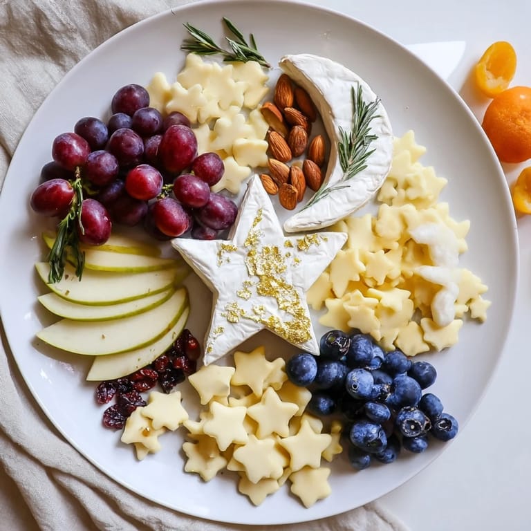 Merken Ein magisches und verspieltes Brett zum Snacken, inspiriert von sternenklaren Nächten, mit einer Auswahl an Käsesorten, Früchten, Nüssen und süßen Leckereien in Mond- und Sternform—perfekt für Treffen oder Nächte unter dem Sternenhimmel.