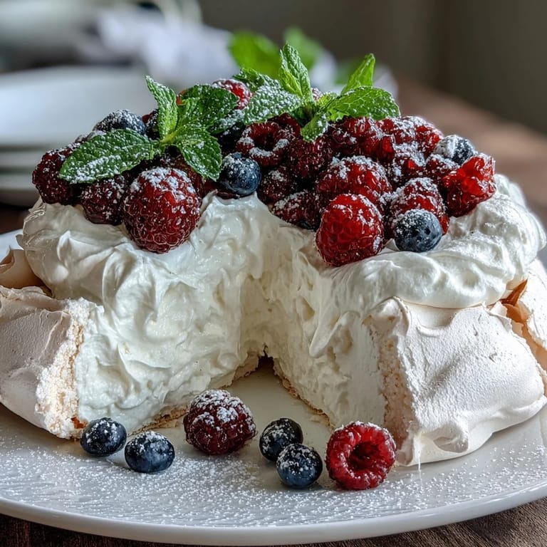 Servieren Sie die Pavlova frisch dekoriert mit Minzblättern und einem leichten Puderzucker-Dusting für ein elegantes Finish.