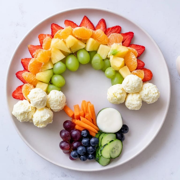 Merken Eine lebendige und verspielte Snackplatte mit einem Regenbogen aus frischem Obst und Gemüse, angeordnet in einer fantasievollen Wolkenform – perfekt für Partys, Kinderzusammenkünfte oder gesunden Snackgenuss.