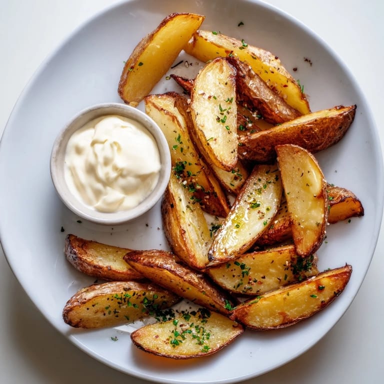 Merken Krosse, im Ofen gebackene Kartoffelspalten, die in aromatischen Kräutern gewälzt und mit einem würzigen, cremigen Senfdip serviert werden. Perfekt als Snack, Beilage oder Party-Vorspeise.