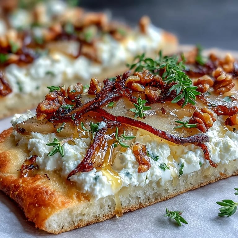 Merken Last summer, a friend arrived at my kitchen with fresh pears from the farmer's market and refused to leave until we turned them into something memorable. We rummaged through my fridge, found some goat cheese going soft at the edges, and decided to build something warm and unexpected on flatbread. That afternoon taught me that the best meals often start with whatever's on hand and a willingness to experiment. This flatbread became our answer to the question: what happens when sweet fruit meets tangy cheese and a whisper of heat?